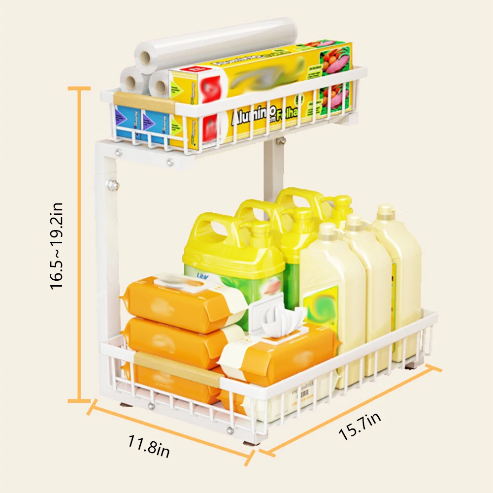 Adjustable Height: With five vertical adjustment levels, this sink organizer is from 16.5 to 19.2 inches, accommodating various cabinet sizes and keeping all your items neatly arranged under the sink for easy visibility.